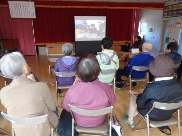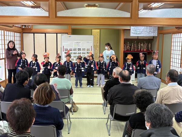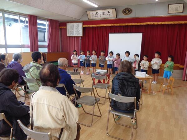 園児の遊んでいる様子やスライドショーを通して、子ども達がどんな風に保育園で生活しているのか知っていただく機会となりました。 また、年長児は歌や手遊びの披露・肩たたきなどを行い、おじいちゃんおばあちゃんとふれあい活動もしました。 |