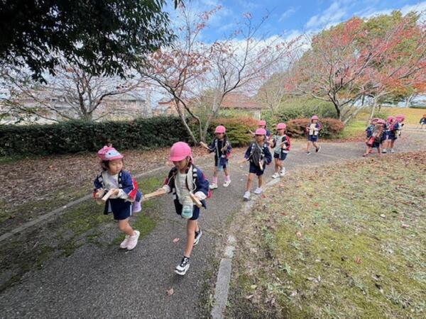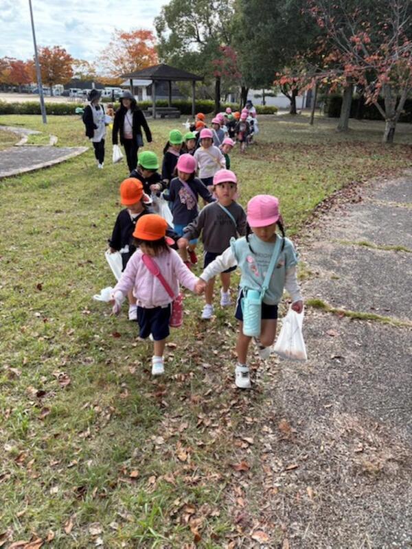 | 11月11日に秋散歩へ出かけました。0・1・2歳児は上西川公園へ、3・4・5歳児はふれあい公園へ行きました。道中では木の実や生き物を見つけ「あそこに〇〇がある!」と言葉や指差しで教えてくれる姿がありました。公園では、赤や黄などに色づいた落ち葉を集めたり杉の実やドングリなどを拾ったりと秋ならではの自然物にたくさん触れることができました。拾った自然物は製作やお店屋さんごっこなどで活用していきます!長い道のりでしたが、お友達としっかり手を繋ぎ交通ルールを守って楽しく散歩を終える事ができました。これからも散歩の機会を大切にしたいです。 | ||