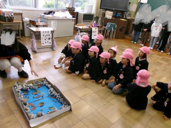 | 稲枝北小の1年生に「秋のフェスティバル」に招待され、年長児が参加しました。校内に入るとドキドキした面持ちでしたが、卒園生でもある1年生に優しく声をかけてもらうと次第に笑顔も見られ、秋の自然物を使った手作り玩具を楽しむ子ども達でした。終わった後は「学校に行くの楽しみ!」「早く1年生になりたい!」と小学校への憧れが強まったようでした。 小学校との連携を密にとり、子ども達が安心して就学できるように取り組んでいきたいです。 |