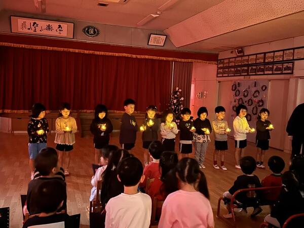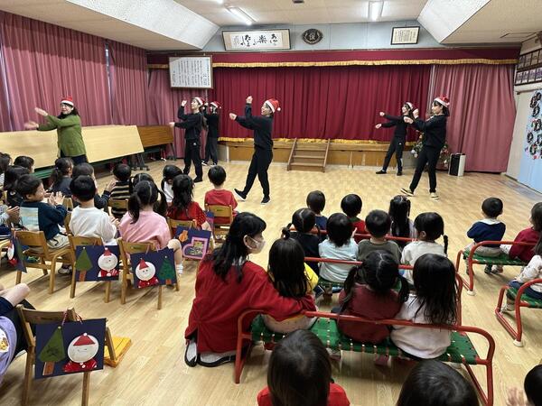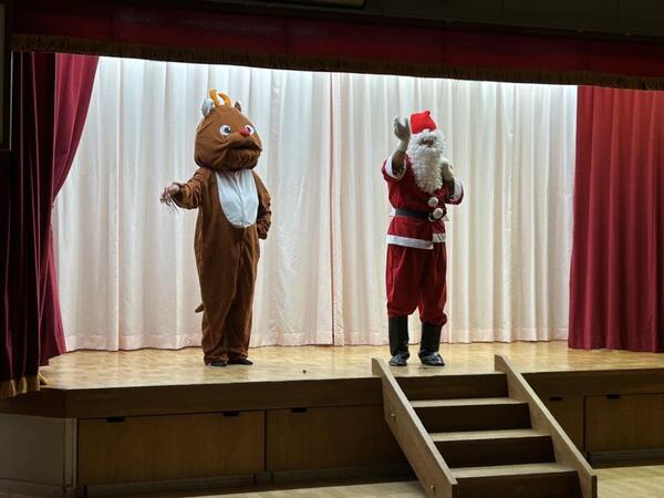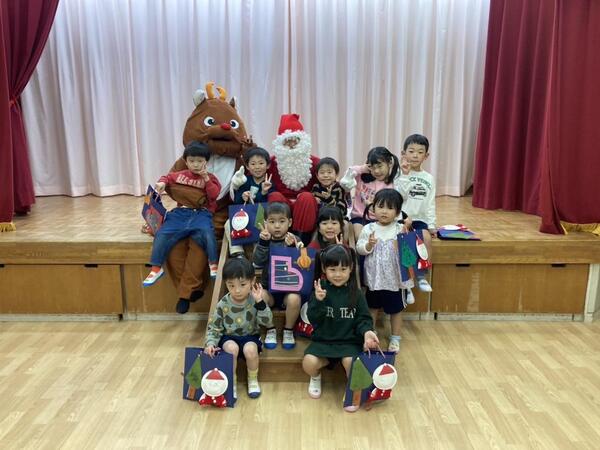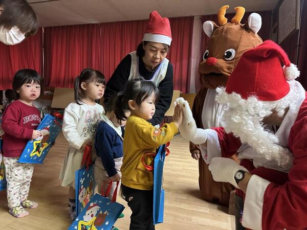 12月25日にクリスマス会を行いました。「あと何回寝たらサンタさん来る?」「プレゼント貰えるかな?」とワクワクしていた子ども達!年長児のキャンドルサービスでは、きよしこの夜の歌に合わせてキャンドルランプを灯し、幻想的な雰囲気を感じました。また、保育者からは「あわてんぼうのサンタクロース」のダンス披露をプレゼント!子ども達も真似っこしたり、手拍子をしたりして楽しむ姿がありました。そして・・・お待ちかねのサンタクロースとトナカイの登場!!「うわ〜!!サンタさんだ!」と大喜び!!「何色が好き?」「誕生日はいつ?」などたくさんの質問をした子ども達です!(^^)!
