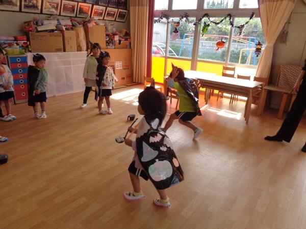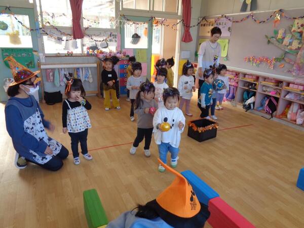 今年も保護者会主催のハロウィンパーティーを行いました。前日から保育室や廊下を可愛く飾っていただきました。当日登園して来るといつもとは異なる園内に「すご〜い!」と嬉しそうな声を響かせていた子ども達(*^^*)ハロウィンパーティーでは、カチューシャや光るブレスレット、手作りのマントを身に付けて仮装をし、ハロウィン釣りやキャンディー投げ、目玉運び、ボーリングなどのゲームを楽しみました。最後は、おかしをプレゼントしてもらい大喜びの子ども達です!異文化に触れる良い機会となりました。