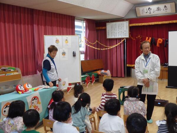 | 人権擁護委員に訪問していただき、人権教室を開催しました。「むしむし村のなかまたち」のDVDを見せてもらい、登場人物の気持ちを考えたり友達に優しくすることの大切さを感じたりすることができました。DVDを見た後は、「私はお絵描きは好きだけど、走るのは苦手」など友達や保育者と話し合う姿があり、違いを認め合う事ができました。これからも乳幼児期から人権教育を大切にしていきたです。 | ||