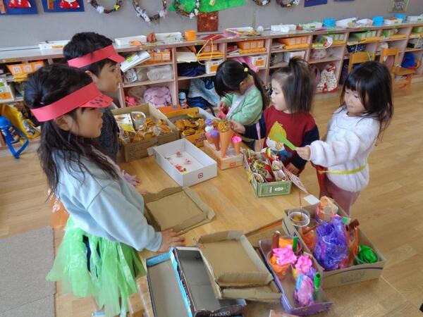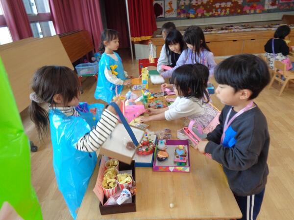 今年は、3日間にわたって開催しました。1日目は園児や職員で、2日目は保育参観で保護者の方と一緒に、3日目は田島市長や理事長さんを招待して、、、店員さんとお客さんさんを楽しみました。