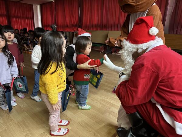 質問タイムの後は、念願のプレゼント渡し。「何のプレゼントかな?楽しみ!」とウキウキで貰う子、人見知りでちょっぴり泣けてしまう子、緊張する子と様々な姿がありましたが、みんなプレゼントを貰った後は「ありがとう!」とお礼伝えたり、ハイタッチをしたりしました。